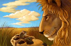 Once when a Lion was asleep, a little Mouse began running up and down upon him. This soon wakened the Lion, who placed his huge paw upon him and opened his big jaws to swallow him."Pardon, O King!" cried the little Mouse, "Forgive me this time. I shall never repeat it and I shall never forget your kindness. And who knows, but I may be able to do you a good turn one of these days?"